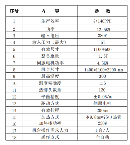 13929409297载线式热铆机主要是通过热铆压合的的工艺流程完成产品胶件的铆合作业。机器热铆动作由伺服电缸控制,能自由控制速度行程。机器具有独立的电气系统,由PLC集中控制,且设备含有MES系统,可通过上位机传输数据,机器可实现手动及自动两种工作方式。具体参数如下: